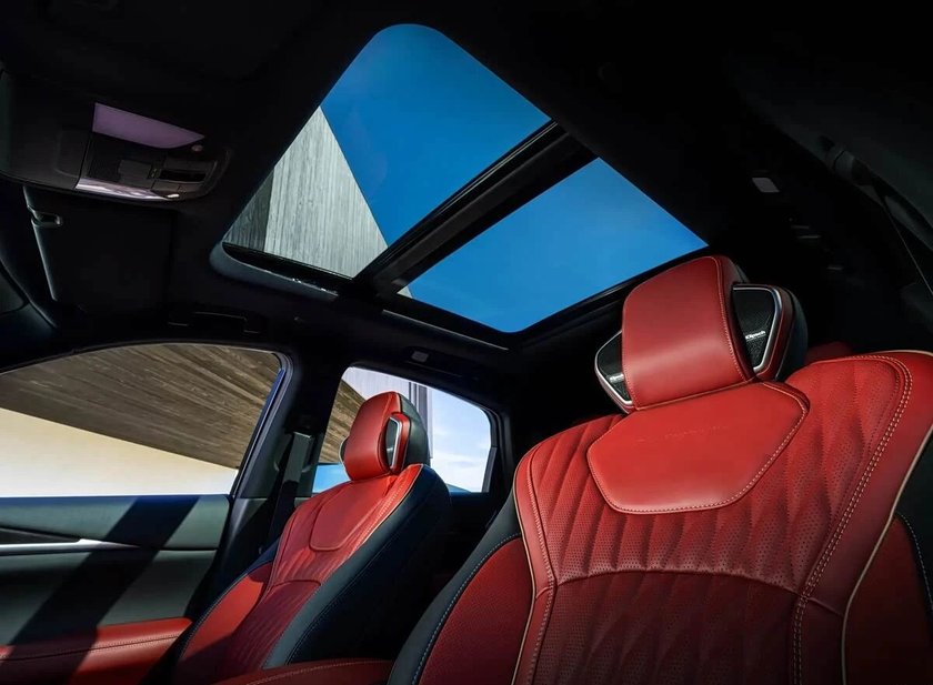 内饰座舱选用黑红撞色搭配,进一步烘托年轻化运动氛围,大面积软性皮质包覆提升车内豪华质感。中控台搭载精致小巧的12.3英寸悬浮中控大屏,适配谷歌智能应用生态;同时配备12.3英寸全液晶仪表与抬头显示功能,中控区域保留实用物理按键,车内还设置专属无线充电面板。前排双座椅自带头枕音响,全车配备20个高品质扬声器,座椅支持加热、通风、按摩多项舒适功能,车内采用舒适5座空间布局。