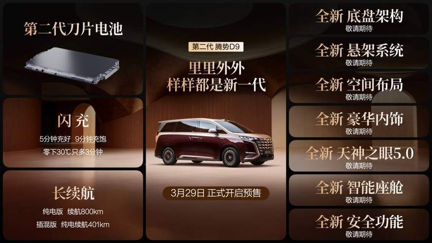 3月29日,备受关注的科技豪华旗舰MPV——第二代腾势D9开启预售,集比亚迪第二代刀片电池、天神之眼 5.0等前瞻科技于一身,在电动、智能、豪华设计等方面全维进化,重塑豪华MPV价值新标杆,堪称时代旗舰,大成之作!