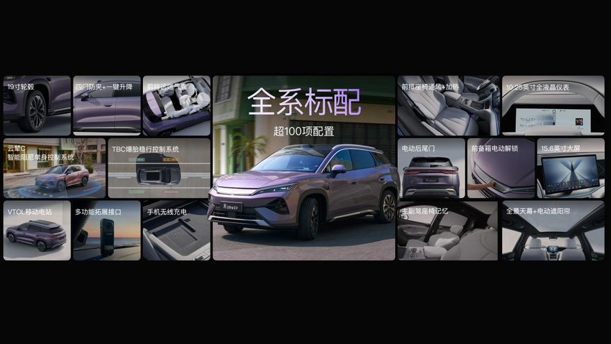 底盘方面,宋Ultra EV全系标配云辇-C智能阻尼车身控制系统,配合前双球头麦弗逊与后五连杆独立悬架,兼顾操控稳定性与乘坐舒适性。TBC高速爆胎稳行系统可在最高140公里/小时时速下爆胎时介入,提升高速行驶安全性。
