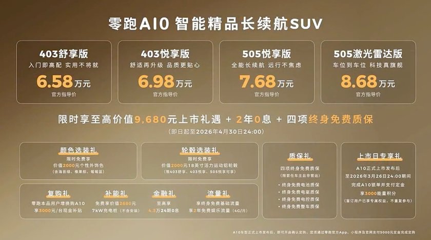 3月26日,零跑A10正式上市了,新车定位纯电小型SUV,6.58万起的价格确实颇具吸引力,关键顶配还带有激光雷达,这确实有着足够的话题和关注度。另外,新车的权益也很不错,比如四项终身免费质保、送充电桩、4.3万两年0息等,都能看出零跑的诚意非常强。那么新车的四款车型又该怎么选呢,索性今天就来和大家聊聊这台车。