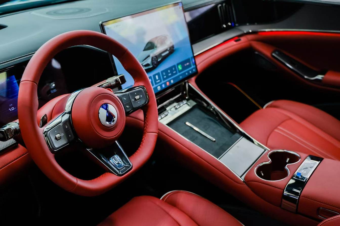 内饰方面,新车采用熔岩红等高级配色,搭配真碳纤维饰板与菱形绗缝一体式运动座椅,营造出兼具运动感与豪华感的座舱氛围。副驾零重力座椅、前后智能冷暖冰箱以及帝瓦雷剧院级声场系统的加持,让每一次出行都成为享受。