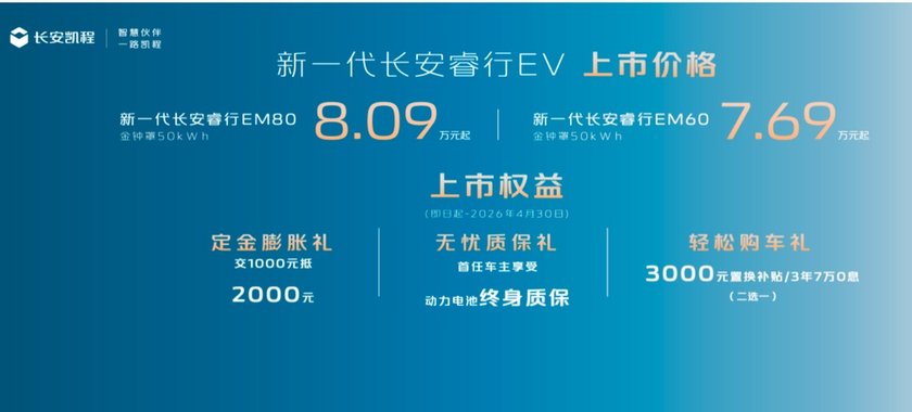 其中,新一代长安睿行EM80(金钟罩50kWh)指导价8.09万元起,新一代长安睿行EM60(金钟罩50kWh)指导价7.69万元起,并支持首任车主享受动力电池终身质保!