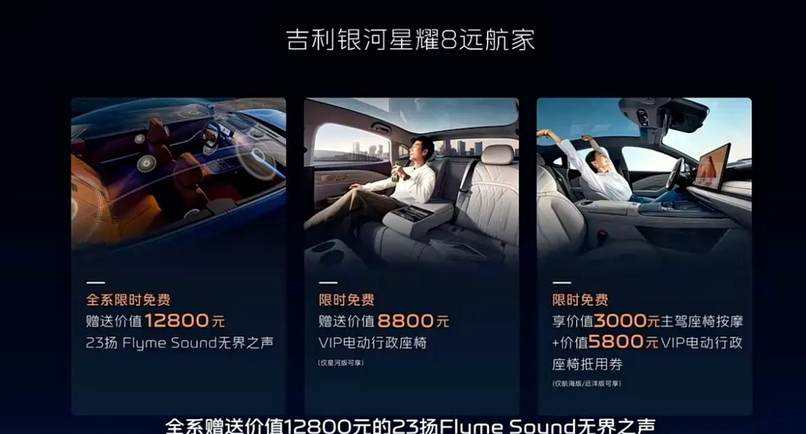 为配合新车上市,吉利银河同步推出了9项限时购车权益,覆盖现金优惠、金融方案、配置升级三大核心维度,切实降低了用户的购车与用车门槛。现金权益层面,包含至高10000元的超级置换金,以及3000元的限时购车补贴;配置升级权益方面,推出了多项限时免费升级与优惠选装政策,其中包括限时免费升级价值12800元的23扬声器Flyme Sound无界之声音响系统,尊享版与星河版可限时免费升级价值8800元的VIP电动行政座椅,航海版、远洋版可限时免费获得价值3000元的主驾座椅按摩功能,同时可获5800元的VIP电动行政座椅抵用券;此外,星河版可限时11000元选装原价20000元的耀夜套装,全系三款新车均可限时2000元选装原价5000元的丹霞矿高定车色。金融方案层面,吉利银河提供了灵活多元的贷款政策,包括7年低息方案,首付2.58万起、月供低至1336元,同时支持至高10万24期0息,或5年贷2年0息的方案,适配不同用户的购车预算规划。