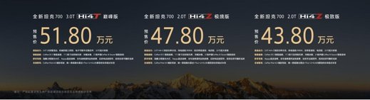 3月30日,“新时代新旗舰——人生自此新境”的坦克品牌发布会上,全新坦克700正式开启预售。新车定位全域豪华SUV新旗舰,推出3.0T Hi4-T、2.0T Hi4-Z两大动力版本共三款车型,官方预售价43.80万—51.80万元。