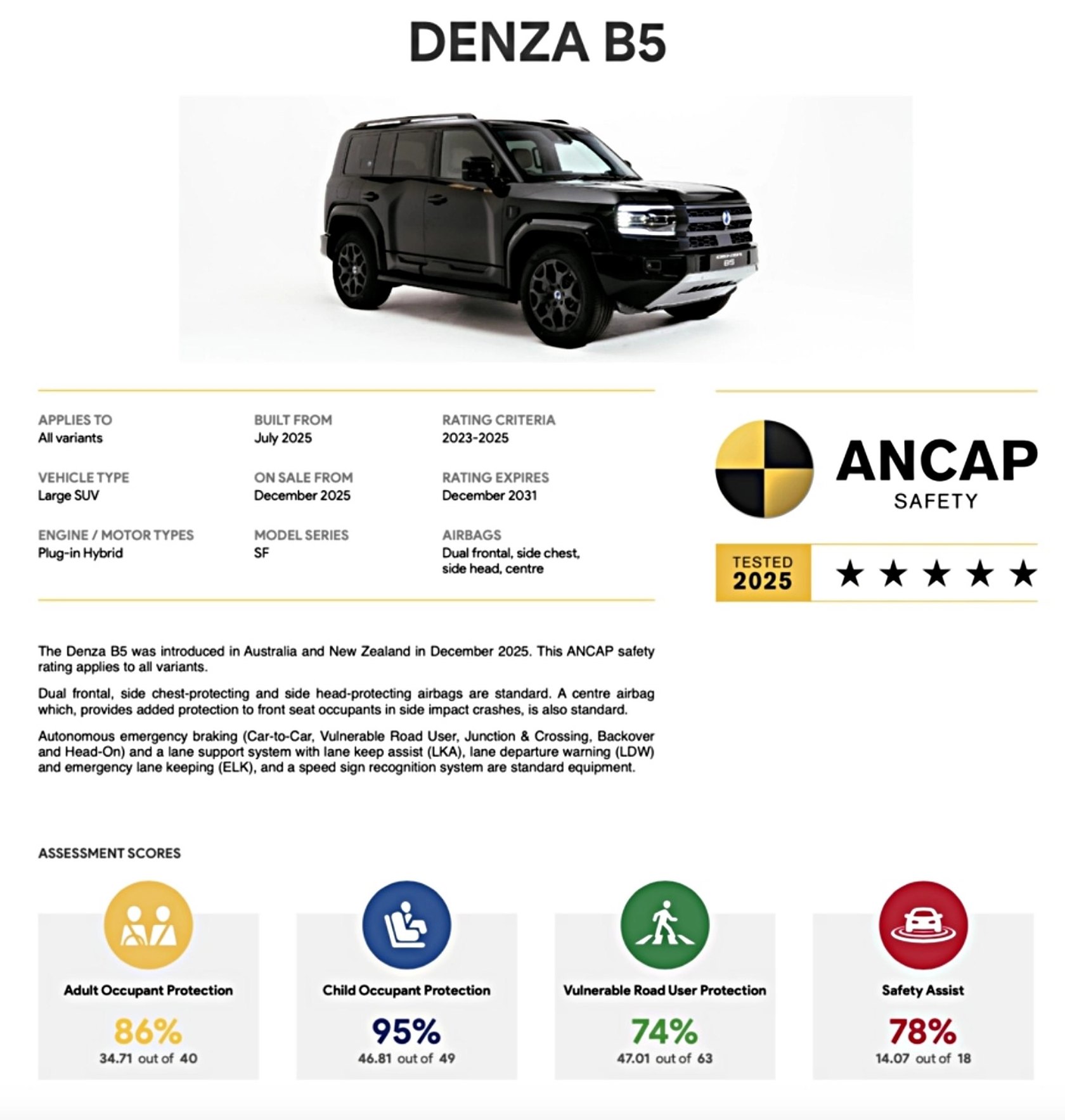 据悉,该测试结果是全球领先的汽车安全评估机构——澳洲新车安全评鉴协会(ANCAP)正式公布的车型安全评级,方程豹豹5凭借卓越的主动和被动安全性能,荣获五星安全评级。在成人保护、儿童保护、行人保护、安全辅助等四大核心板块测试项目均达到全球领先水平,其中儿童保护得分率为95%,是ANCAP历年测试结果中排名最高的车型之一。