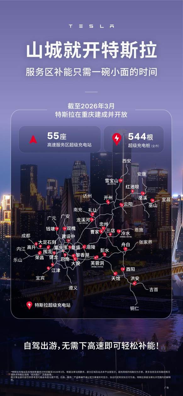 55座落地重庆!特斯拉国内规模最大高速服务区超级充电站正式启用