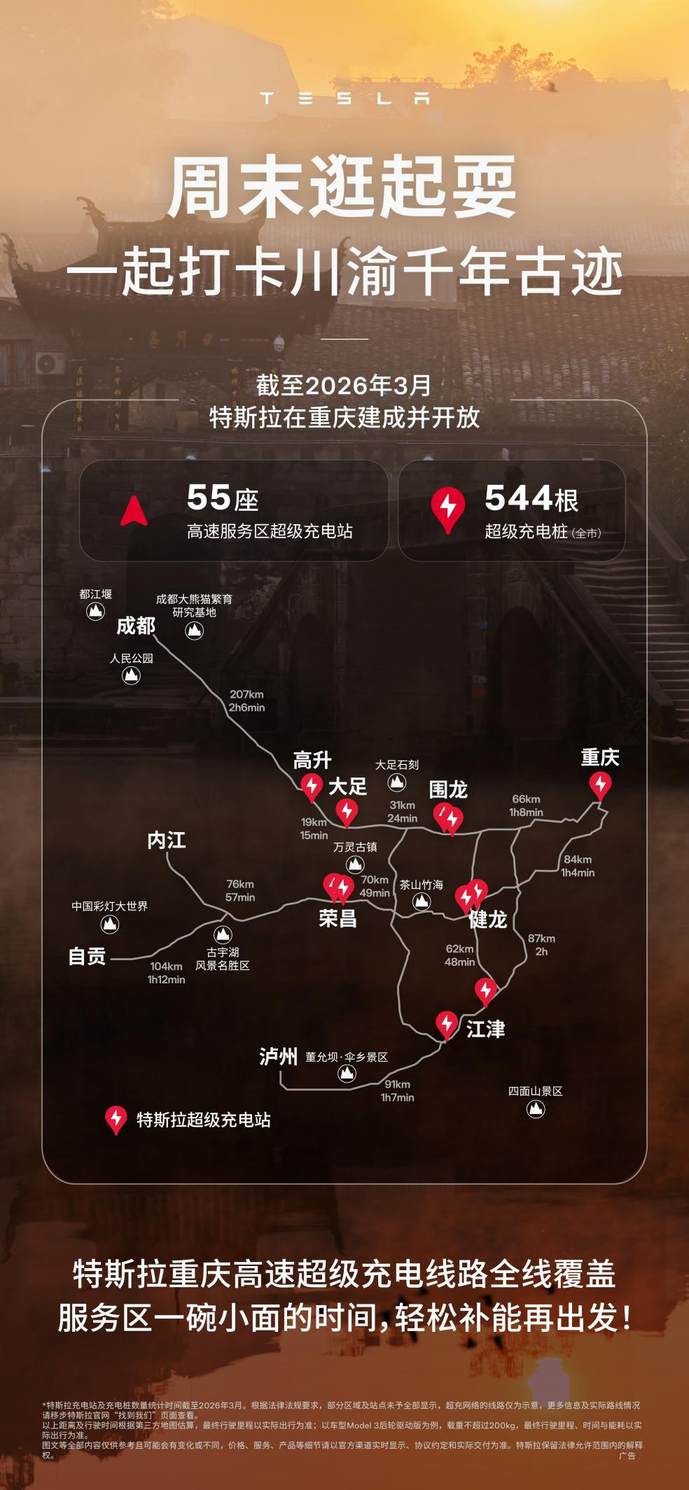 此次高速服务区超充站上线,将吸引数以百万计的各地特斯拉车主往来重庆,饱览大足石刻、酉阳龚滩古镇、奉节白帝城等5A/4A级景区风光,畅游中西部地区的雄奇山水,用纯电智能出行方式打开更大更新的空间。