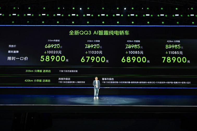 全新QQ3携310km、420km两种续航版本,共推出4款车型,限时一口价售价区间为5.89万元至7.89万元。与价格同步公布的,还有针对首批车主打造的“一部到位礼”权益包,全面覆盖金融、用车、服务三大维度,让用户购车无忧、用车安心。全新QQ3以5.89万的起售价,精准契合年轻人第一台车的心理预算,更在核心产品力上实现突破——2700mm超长轴距、82%高强度钢+16%热成型钢的安全车身、高通8155芯片+Carmind大模型的智能化配置,形成了鲜明的产品优势。这种进化,精准洞察了当下年轻购车者的核心需求:预算有限,但对安全、质感、科技的追求从未降低。他们既渴望颜值个性的表达,也重视实用可靠的出行体验,全新QQ3正是以“全维度满足”的姿态,回应每一位用户的期待。