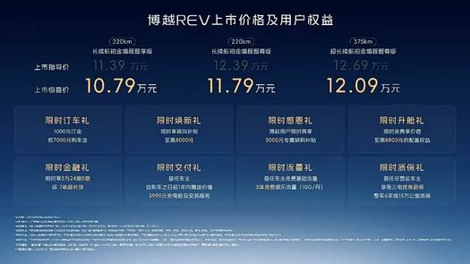 3月31日,吉利品牌首款纯增程动力车型博越REV正式上市,新车官方指导价11.39万-12.69万元,上市惊喜价10.79万-12.09万元。该车定位紧凑型增程SUV,是12万级唯一实现CLTC纯电续航375km、综合续航1525km的增程车型,也是博越系列推出的首款纯增程版本车型。