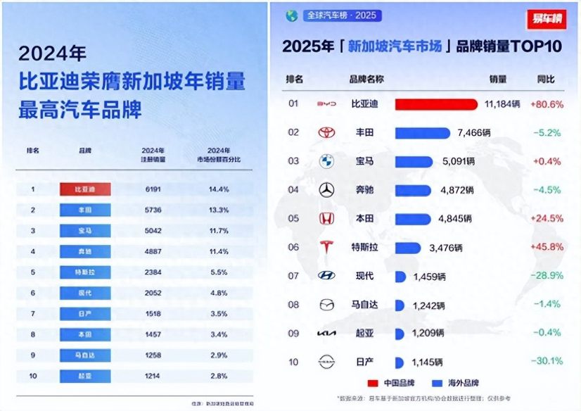 近期,据新加坡陆路交通管理局数据显示,2025年,比亚迪乘用车在新加坡销售11184辆,同比增长80.6%,蝉联年度全品牌销量冠军。自2022年,比亚迪正式进入新加坡乘用车市场,仅用两年时间成功登顶榜首,助力新加坡电动化转型。