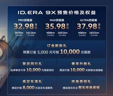 3月30日,上汽大众ID.ERA 9X正式开启预售,共推出3款不同配置车型,其中上汽大众ID.ERA 9X PRO四驱版预售价32.98万元,MAX四驱版预售价为35.98万元,ULTRA四驱版预售价37.98万元。