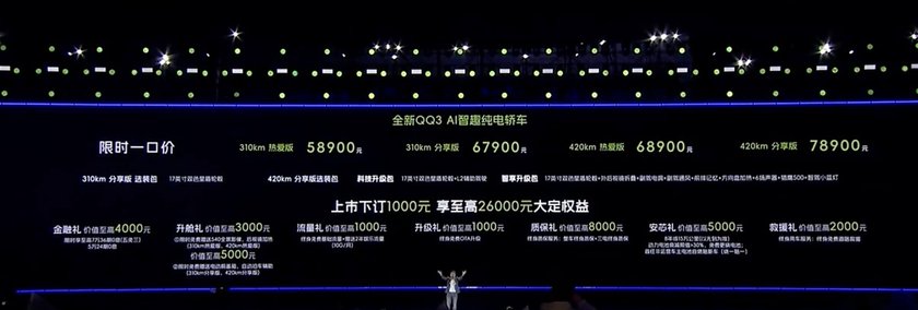 3月30日,奇瑞QQ3 EV正式上市了,新车共推出4款车型,限时一口价5.89-7.89万元。相比于吉利星愿、零跑A10、MG4等竞品车型,奇瑞QQ3 EV不仅价格低,而且它的轴距不算小。更为关键的是,如果想要后驱+后独立悬挂,同时还要更低的预算买到400km+版本的代步车,似乎也只有奇瑞QQ3 EV了,这也是为什么它的关注度尤为高。