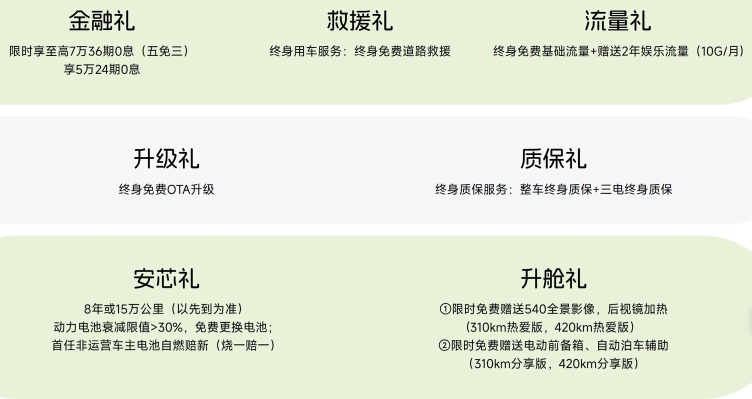另外,新车的权益也非常不错,这里说两个笔者觉得不错的权益,比如整车+三电终身质保,终身免费道路救援,首任非运营车主电池自燃赔新(烧一赔一),这三点可以说非常诱人了。具体的权益笔者直接放图,大家可以看一下。