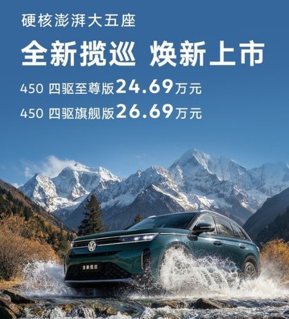 全新揽巡定位硬核澎湃大五座 SUV,共推出 2 款车型,官方指导价 24.69 万 - 26.69 万元,针对外观、内饰、智能化全面升级,主打中高端家用 SUV 市场。搭载第五代 EA888 2.0T 发动机,高功率版最大功率 200kW,零百加速仅 7 秒,匹配 7 速湿式双离合,兼顾澎湃动力与操控稳定性。车长超 5 米,大五座布局带来宽敞驾乘空间,配备 IQ.Pilot 增强驾驶辅助、三屏智舱,智能驾驶与科技体验全面进阶。购车可享基础置换 10000 元、老客户额外 4000 元、报废置换至高 5000 元补贴,入手更划算。