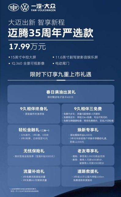 值此 35 周年之际,一汽 - 大众发布 “9 久相伴” 九大服务权益,构建三终身 + 三免费 + 三保障的全生命周期用车体系,覆盖购车、用车、养车、换车全流程。首任车主享整车终身质保、原装备件终身质保、终身免费道路救援,彻底打消后期维修、配件、出行安全顾虑。免费取送车、免费代步车、免费车辆健康检测,维保不用跑、修车有车开、隐患早排查,省时又省心。二手车保值回购、专属管家服务、车主俱乐部积分权益,从换车到日常关怀,全方位守护用户用车生活。