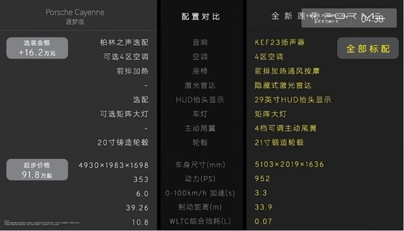 冯擎峰在最后价格公布前,发布了一张莲花For Me与保时捷Cayenne(卡宴)的性能对比图,前者以一半左右的投入,在动力、底盘、能耗、补能等核心维度实现对Cayenne(卡宴)的全面超越,堪称一份性能维度更高、标配更全、价格更低,堪称是全方位领先的“性能更强、配置更满、成本更低”的系统性方案。