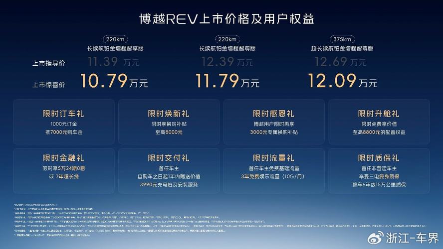 作为吉利博越十周年重磅力作,博越REV本次共推出三大版型:220km长续航铂金增程智享版、220km长续航铂金增程智尊版及375km超长续航铂金增程智尊版,上市惊喜价10.79万-12.09万元,起售价相比12.79万元的预售价格,整整下探了2万元,其中375km超长续航版本惊喜价12.09万元起,以同级领先纯电续航实力,树立A+级增程SUV价值新标杆。博越REV凭借吉利大厂品质和越级产品力,以极具诚意的售价,让20万级的高端增程体验走进更多家庭。