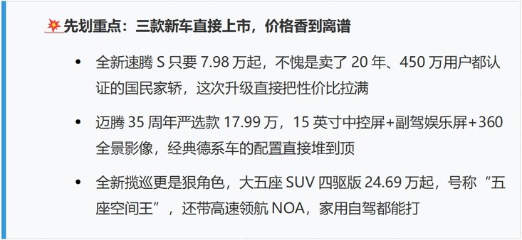 家人们谁懂啊!3月31号一汽-大众在厦门开的春季发布会,直接扔出王炸级阵容——5款新车同时登场,燃油、插混全都有,轿车、SUV全覆盖,看完我直接把换车计划提上日程了!