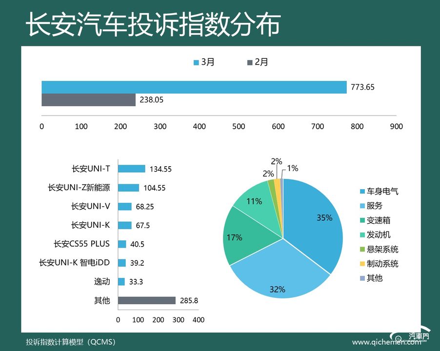 汽车质量投诉点评:3月份,长安汽车的投诉指数也大幅反弹。与上汽通用别克一样,长安汽车本月也未出现新的集中投诉。变速箱顿挫/无法换挡和车机卡顿不升级问题本月再次招致了车主的吐槽。而且,长安汽车的投诉分布比较分散,问题集中度和车型分布集中度都较低。