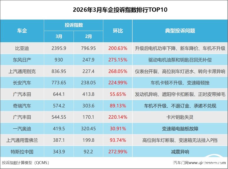 2026年3月车企投诉指数排行:多车企遭集中投诉