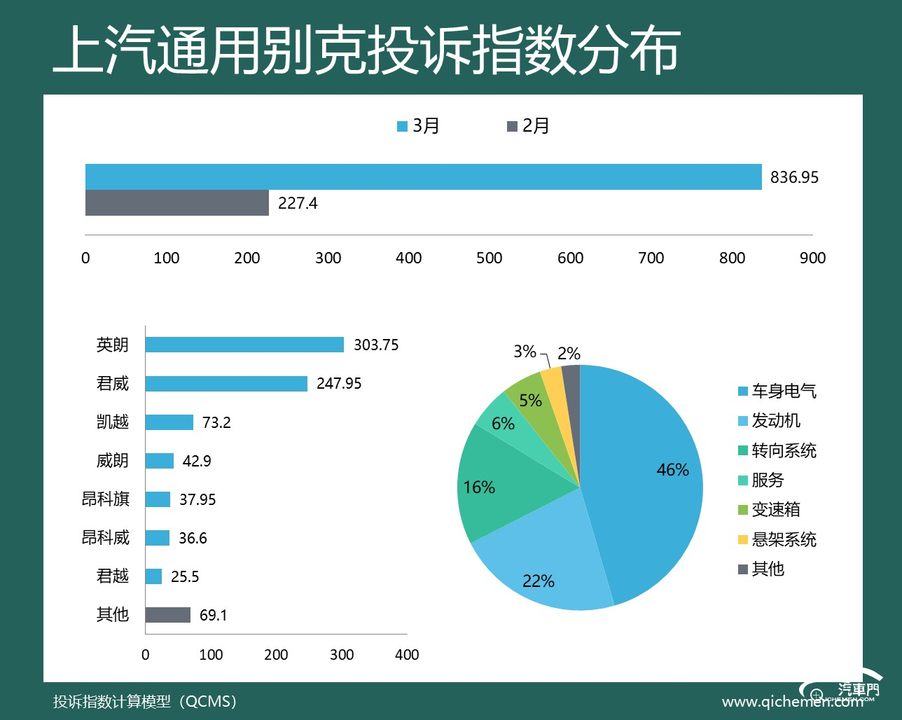 汽车质量投诉点评:短暂的投诉指数下降后,上汽通用的投诉指数再次大幅攀升。3月份,上汽通用别克的投诉指数达到了836.95,排在了投诉榜的第三位。而从投诉反馈来看,仪表台开裂、高位刹车灯开裂、转向卡滞异响仍然是主要槽点。