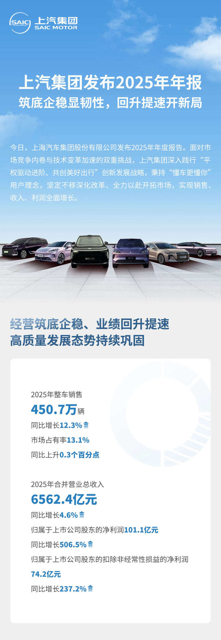 年报显示,2025年上汽集团实现整车销售450.7万辆,同比增长12.3%,市场占有率13.1%,同比上升0.3个百分点;全年实现合并营业总收入6562.4亿元,同比增长4.6%;归属于上市公司股东的净利润101.1亿元,同比增长506.5%,归属于上市公司股东的扣除非经常性损益的净利润74.2亿元,同比增长237.2%,经营筑底企稳、业绩回升提速,高质量发展态势持续巩固。