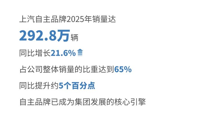 全面深化改革,自主品牌扛起大旗,合资品牌焕新加速。2025年,上汽自主品牌销量达292.8万辆,同比增长21.6%,占公司整体销量的比重达到65%,同比提升约5个百分点。自主品牌已成为集团发展的核心引擎。