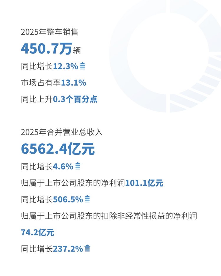 年报显示,2025年上汽集团实现整车销售450.7万辆,同比增长12.3%,市场占有率13.1%,同比上升0.3个百分点;全年实现合并营业总收入6562.4亿元,同比增长4.6%;归属于上市公司股东的净利润101.1亿元,同比增长506.5%,归属于上市公司股东的扣除非经常性损益的净利润74.2亿元,同比增长237.2%,经营筑底企稳、业绩回升提速,高质量发展态势持续巩固。