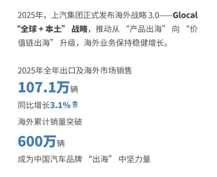 擦亮全球品牌,夯实国际经营,合力拓展新市场。2025年,上汽集团正式发布海外战略 3.0——Glocal“全球 + 本土” 战略,推动从 “产品出海” 向 “价值链出海” 升级,海外业务保持稳健增长,2025年全年出口及海外市场销售107.1 万辆,同比增长 3.1%,海外累计销量突破 600 万辆,成为中国汽车品牌“出海”中坚力量。