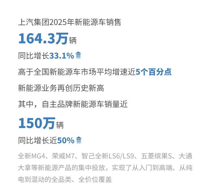 磨砺核心技术,加快量产上车,培育新质生产力。2025年,上汽集团新能源车销售164.3万辆,同比增长33.1%,高于全国新能源车市场平均增速近5个百分点,新能源业务再创历史新高。其中,自主品牌新能源车销量近150万辆,同比增长近50%。全新MG4、荣威M7、智己全新LS6/LS9、五菱缤果S、大通大拿等新能源产品的集中投放,实现了从入门到高端、从纯电到混动的全品类、全价位覆盖。