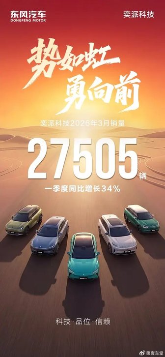 一季度同比三连涨!4月1日,东风奕派汽车科技公司(简称:奕派科技)最新销量数据,3月交付27505辆,同比增长30%;1-3月累计交付63659辆,同比增长34%,连续三个月同比增长,步入高质量发展快车道。海外市场方面,公司旗下东风奕派品牌的纳米01车型累计出口已超3万辆,稳居小型纯电出海第一梯队;东风风神品牌一季度累计出口超1.2万辆,拓展势头持续向好。