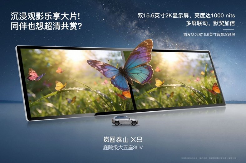 3月31日,岚图汽车官方宣布,岚图泰山X8将首搭华为双15.6英寸大双联屏。这意味着,岚图泰山X8先于“境”“界”,成为行业首款搭载华为双联屏的车型,以领先者姿态,重新定义高端家用旗舰的智能标杆。