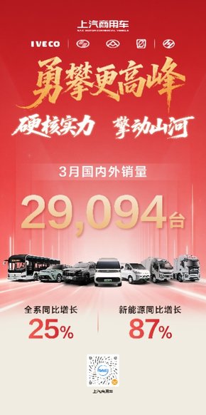 上汽商用车3月热销29,094辆,同比大增25%,国内海外双破万创新高