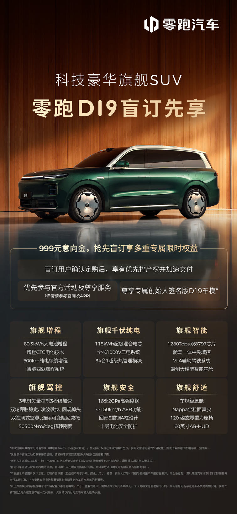 “真旗舰,见真章”,零跑旗舰 D 平台的首款车型——零跑D19将于4月16日正式上市。目前盲订权益仍在进行中,用户支付999元意向金,确认定购后可享优先排产权、加速交付、优先参与官方活动及尊享服务,并可获得专属创始人签名版D19车模(限量2000名)。