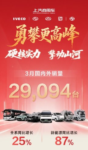 上汽商用车3月热销29,094辆,同比大增25%,国内海外双破万创新高