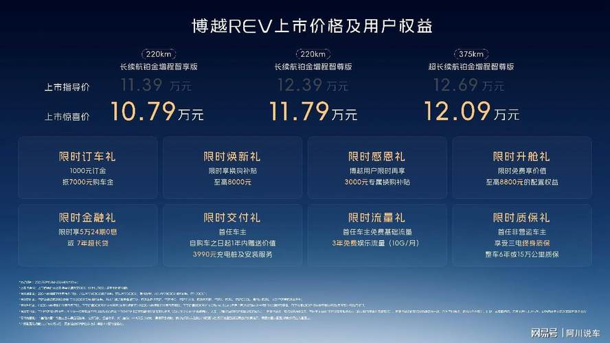 作为吉利博越十周年重磅力作,博越REV本次共推出三大版型:220km长续航铂金增程智享版、220km长续航铂金增程智尊版及375km超长续航铂金增程智尊版,上市惊喜价10.79万-12.09万元,起售价相比12.79万元的预售价格,整整下探了2万元,其中375km超长续航版本惊喜价12.09万元起,以同级领先纯电续航实力,树立A+级增程SUV价值新标杆。博越REV凭借吉利大厂品质和越级产品力,以极具诚意的售价,让20万级的高端增程体验走进更多家庭。
