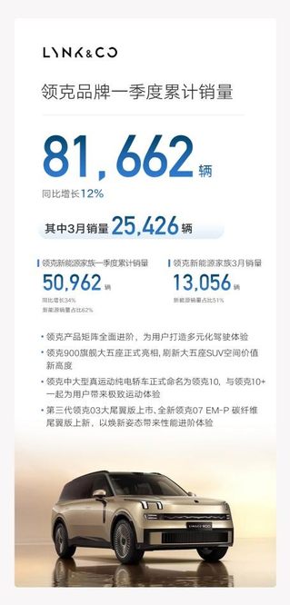 2. 领克:3月销量25426辆;一季度累计销量81662辆,同比增长12%。