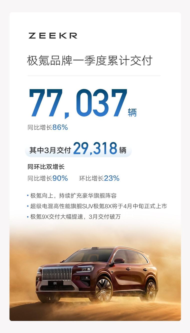 1. 极氪:3月交付29318辆,同比增长90%、环比增长23%;一季度累计交付77037辆,同比增长86%。