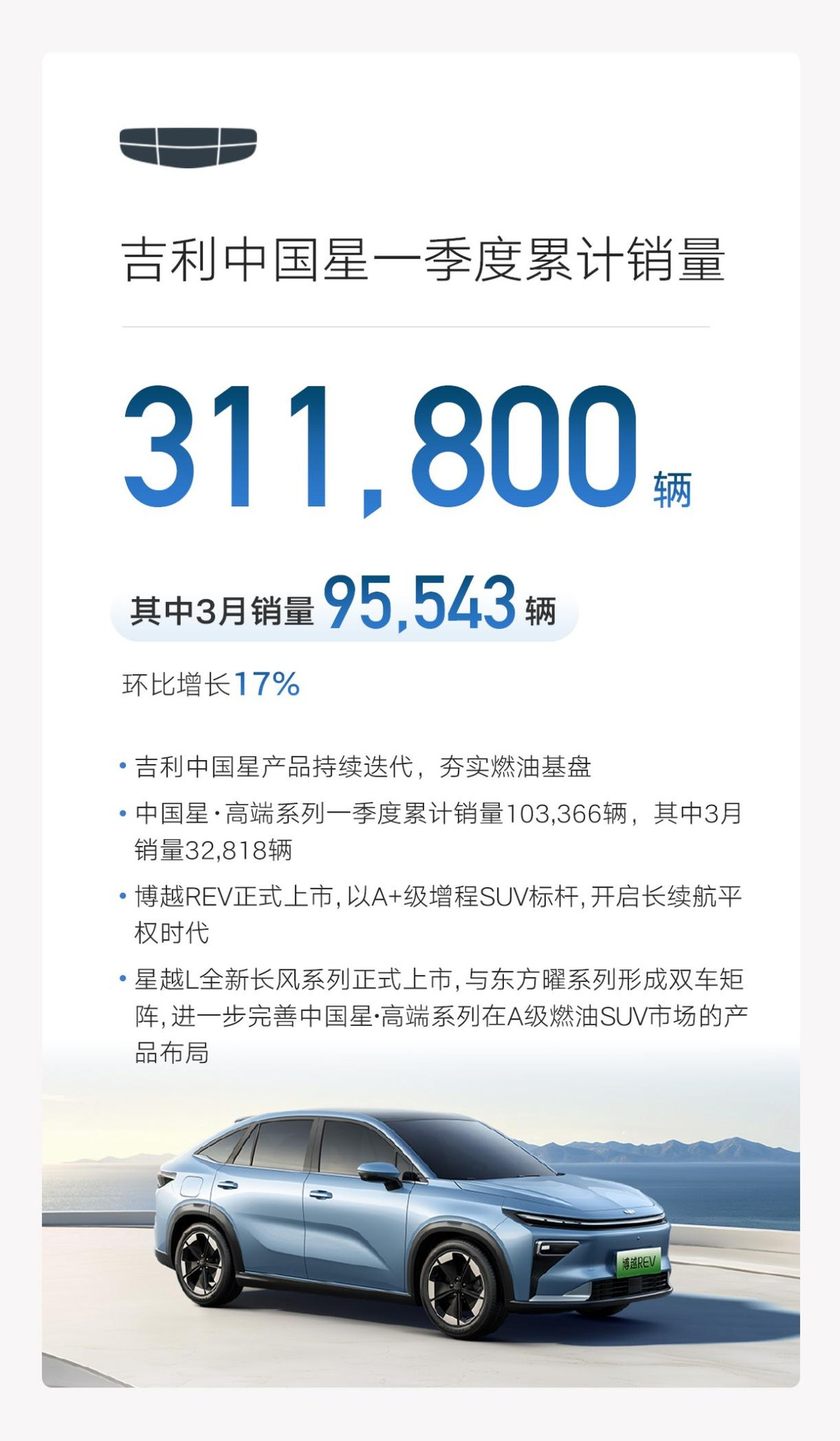 4. 吉利中国星:3月销量95543辆;高端系列(星越L、星瑞、星瑞L)32818辆(含出口)。