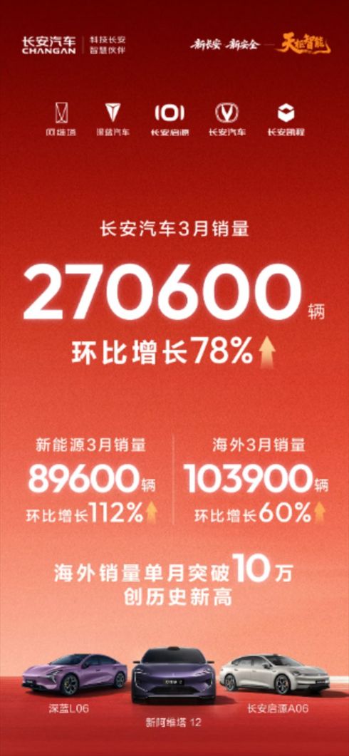 4月1日,重庆长安汽车股份有限公司(以下简称“长安汽车”)公布了最新的销量成绩。数据显示,长安汽车3月销量达270600辆,环比增长78%;海外销量创历史新高,达103900辆,环比增长60%;新能源销量89600辆,环比增长112%。在汽车消费政策切换、去年底市场需求提前释放的背景下,长安汽车仍然保持稳健增长势头,彰显了新央企的增长韧性与发展质量。