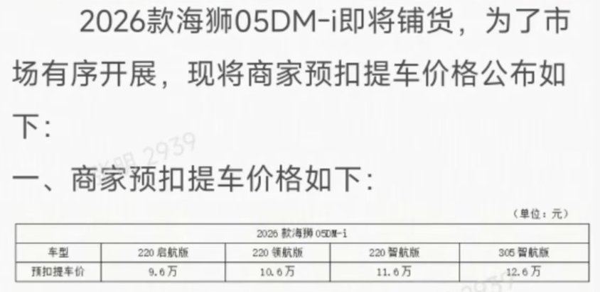 另据经销商预扣款信息来看,新车或提供220启航版、220领航版、220智航版、305智航版四款车型,预扣提车价分别为9.6万、10.6万、11.6万、12.6万,其中220智航版、305智航版可选装天神之眼B,预扣提车价增加1万元。当然,关于新车的信息还有待官方进一步公布,那么,您认为26款海狮05DM-i定价多少合适呢?欢迎留言评论。