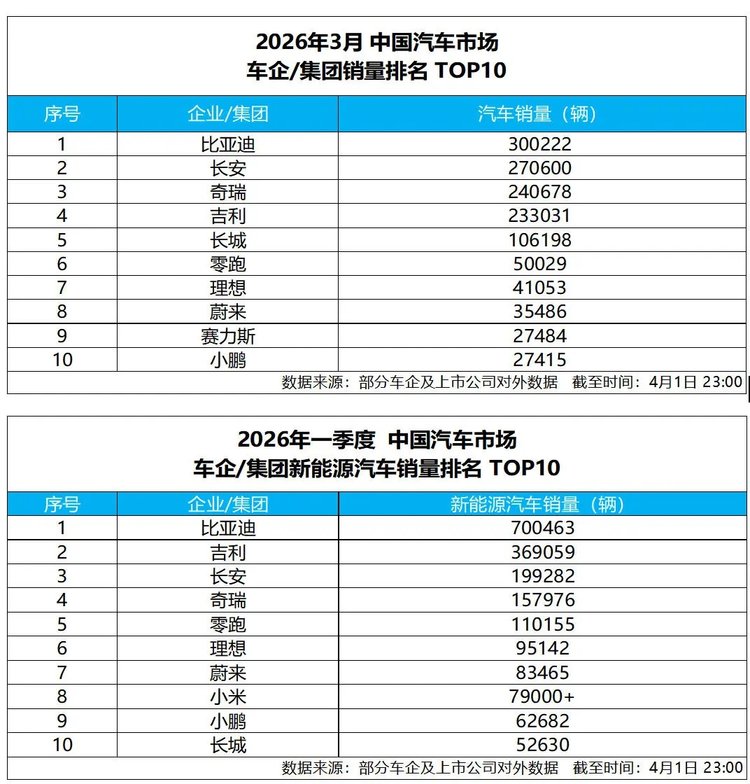 4 月 1 日,比亚迪发布 2026 年 3 月产销数据,单月总销量达300222 辆,强势突破 30 万辆大关,斩获中国车企销量冠军,并连续 58 个月蝉联中国新能源汽车销量冠军,持续稳固行业龙头地位。截至目前,比亚迪新能源汽车累计销量已超1580 万辆,一季度累计销售 700463 辆,以硬核数据印证技术与规模双重实力,助力一季度完美收官。