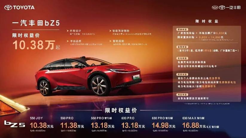 纯电车型bZ5在4月推出限时权益加码,置换权益升级为不限品牌厂补8000元,更可叠加9000-14600元的国家置换补贴,550JOY车型叠加厂补及国补后,限时权益价低至10.38万元。金融权益也是诚意满满,0首付3年0息,低月供5年0息,降低购车门槛(置换、金融二选一)。同时匹配免费充电桩、500元电卡、非营运车主三电终身质保及电池三兜底保障政策,为后续用车提供安心保障。4月购车用户还可免费获赠天窗遮阳帘,舒适加倍。