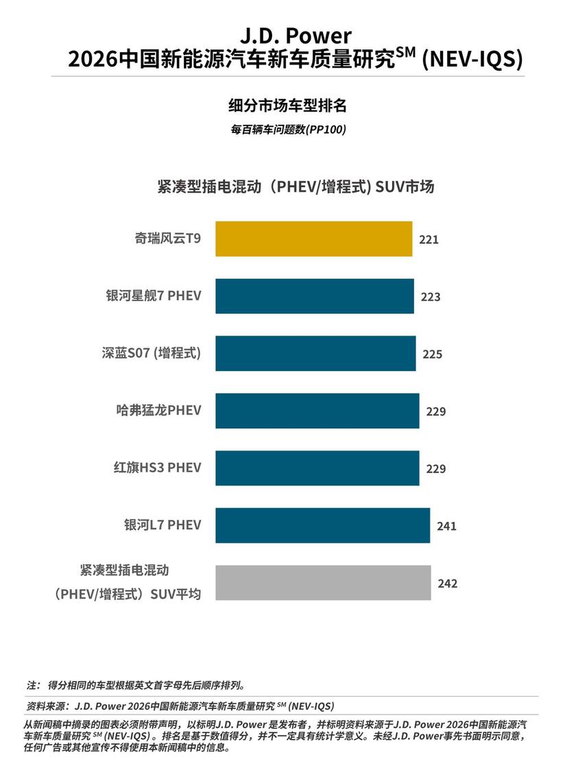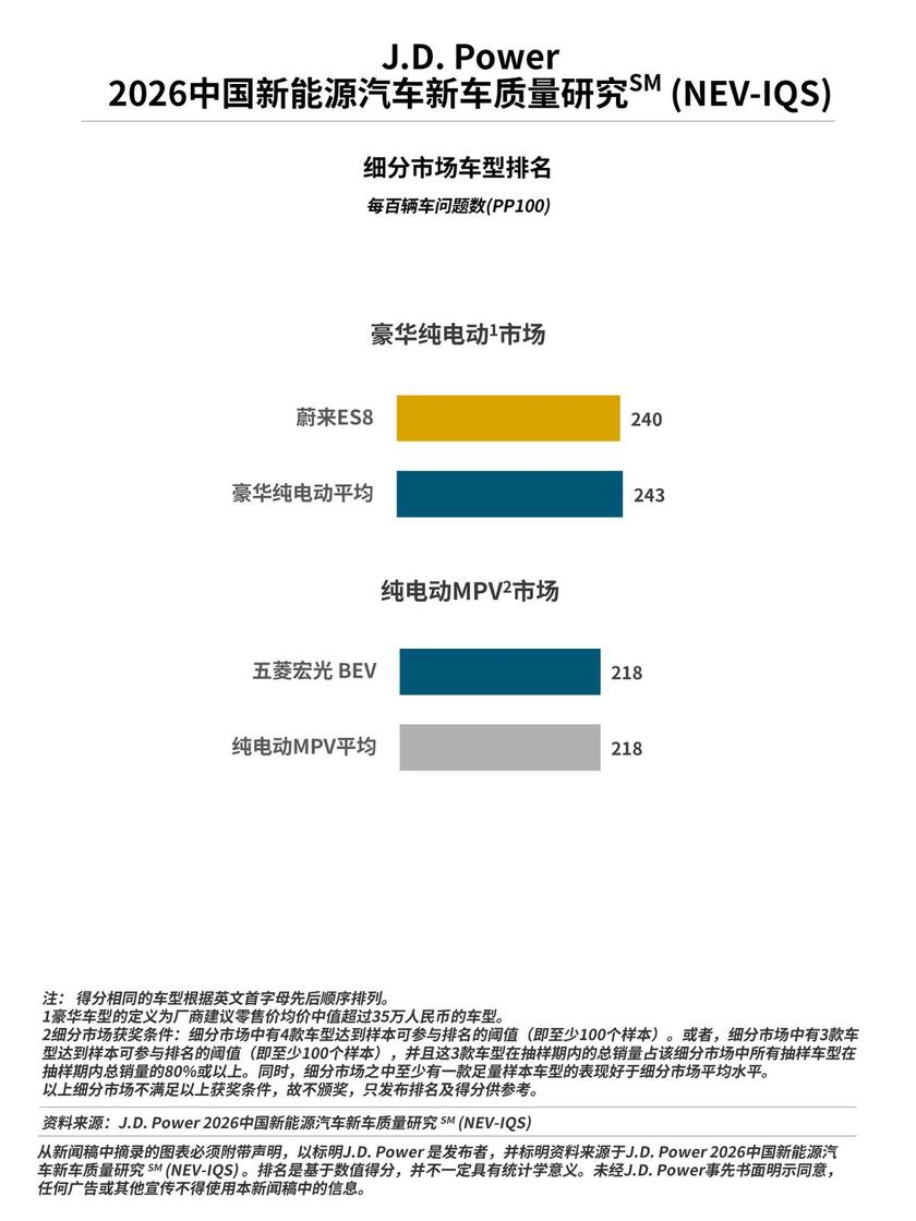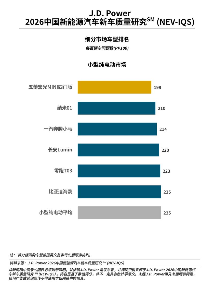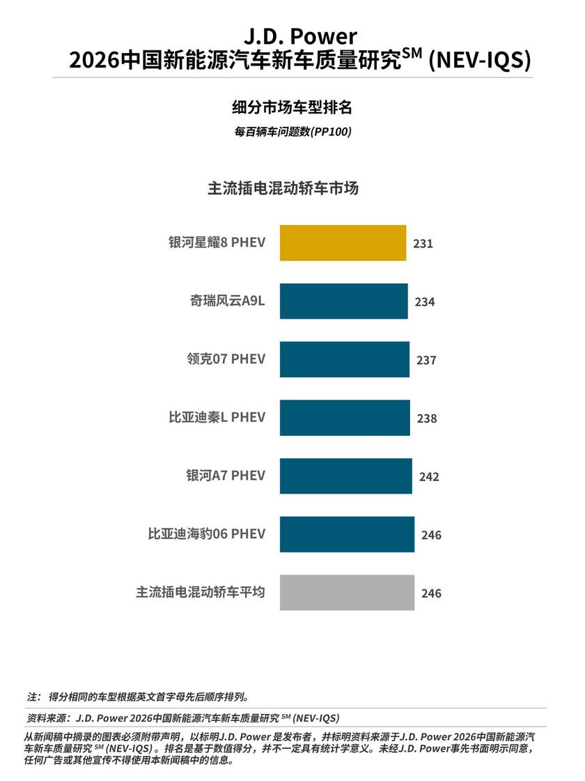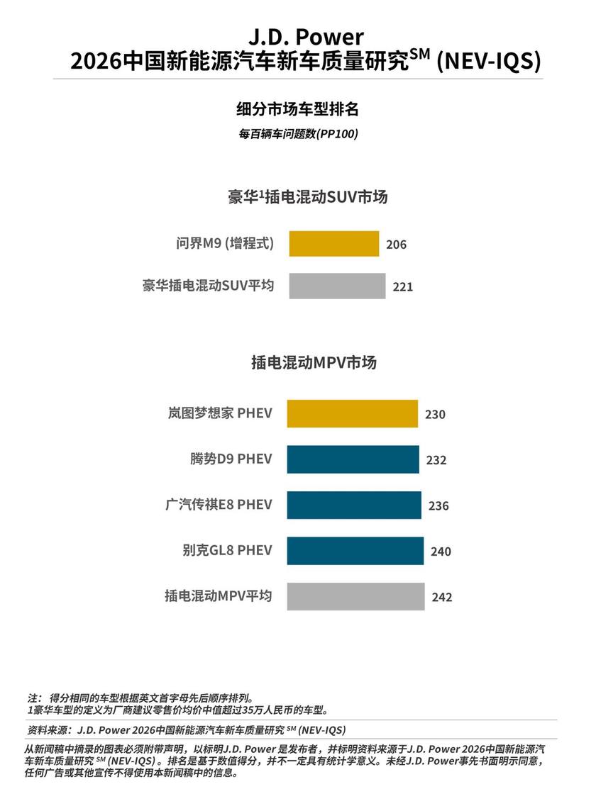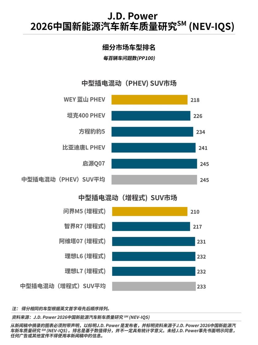 4月2日,J.D. Power|君迪正式发布2026中国新能源汽车新车质量研究SM(NEV-IQS),是J.D. Power连续第八年在中国发布这一研究,该研究基于J.D. Power行业通用的新车质量研究IQS体系,并针对新能源车特有问题进行补充,该研究统计和衡量了新能源汽车新车车主在2至6个月的拥车期内遇到的质量问题。新车质量以平均每百辆车问题数(PP100)表达,问题数越低,质量越好。
