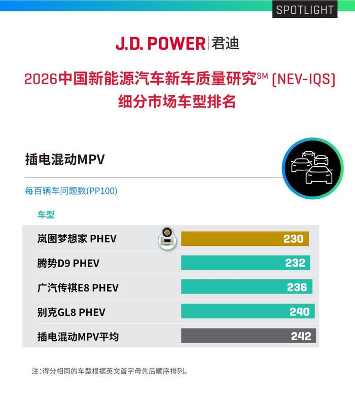 4月2日,在J.D. Power发布的2026中国新能源汽车新车质量研究(NEV-IQS)中,岚图梦想家荣膺插电混动MPV质量第一,成为唯一获奖的MPV车型。