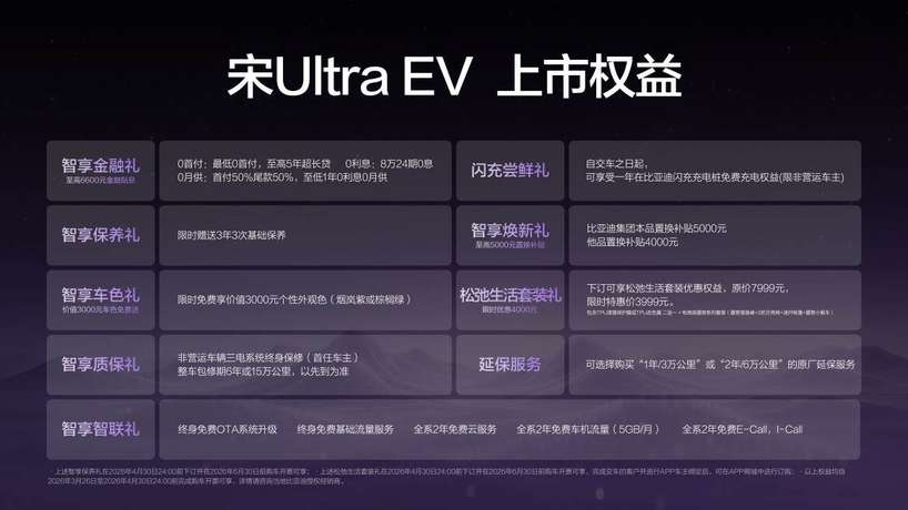 3月26日,比亚迪王朝全新力作——宋Ultra EV正式上市,官方指导价15.19万元起,共推出605KM领先型、605KM超越型、710KM超越型和710KM卓越型四款配置,顶配仅17.99万元。价格一出,现场掌声不断。更让人心跳加速的,是随之公布的“0元购、0元用、0元养”超重磅购车权益——从买车到用车再到养车,比亚迪想替你“全包了”!