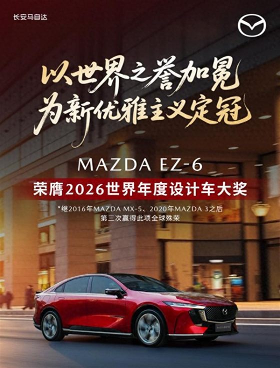 纽约时间4月1日。2026纽约国际车展首日,全球汽车行业最具权威性的世界年度风云车大奖(World Car Awards)正式公布最终获奖名单。长安马自达MAZDA EZ-6(海外市场命名MAZDA 6e)凭借“新优雅主义轿跑”的突破性设计表达、电动化时代「魂动」美学的全新演绎,从全球众多重磅车型中脱颖而出,一举斩获2026世界年度设计车大奖。