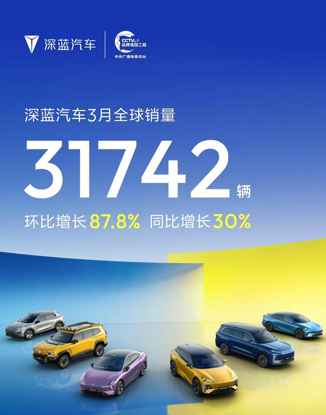 深蓝汽车3月销量31742台 环比增长87.8%,同比增长30%