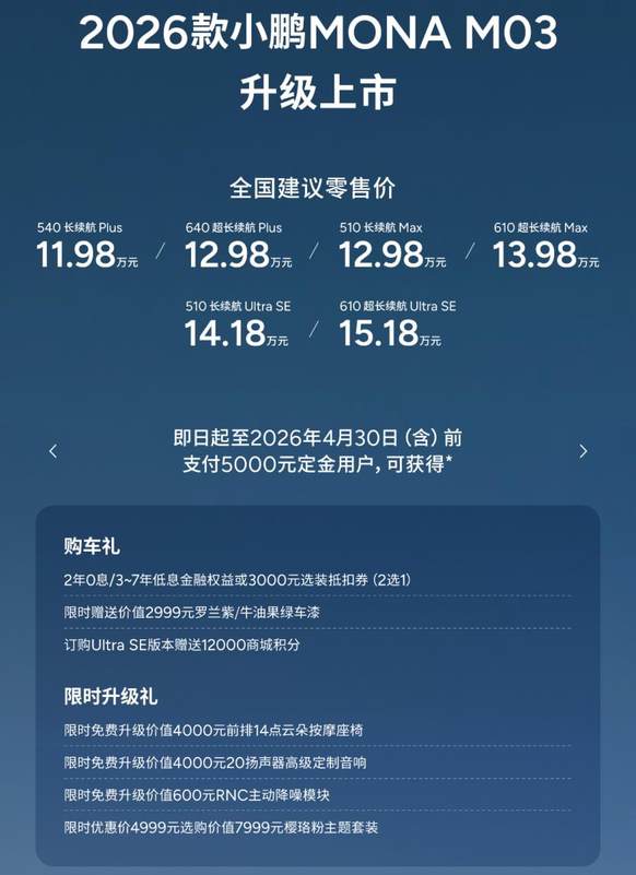 11.98万起!产品力对标20万级!2026款小鹏MONA M03加量不加价