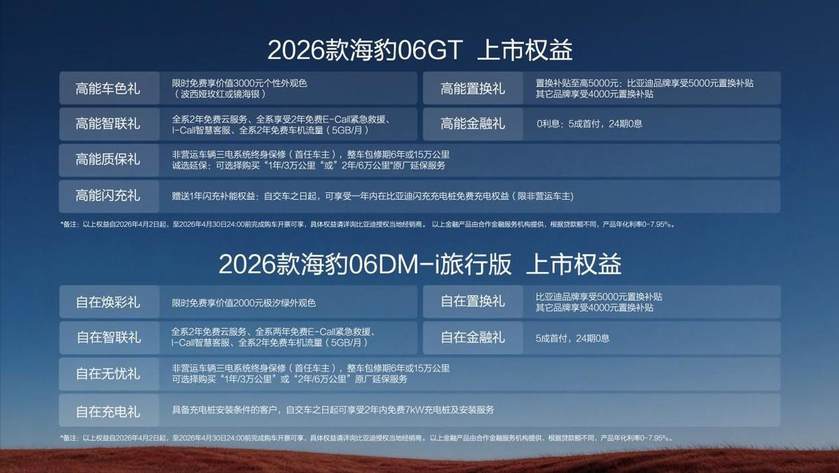 4月2日,比亚迪海洋网双车齐发——2026款海豹06GT与2026款海豹06DM-i旅行版同步上市。其中,2026款海豹06GT官方指导价为12.89-16.99万元,2026款海豹06DM-i旅行版官方指导价为11.19-13.99万元,两款新车还为用户提供涵盖购车、选装、养护等在内的多项权益,让用户真正实现无忧用车,2026款海豹06GT用户更可享受1年闪充补能权益,尽情领略全场景自由闪充的科技魅力。